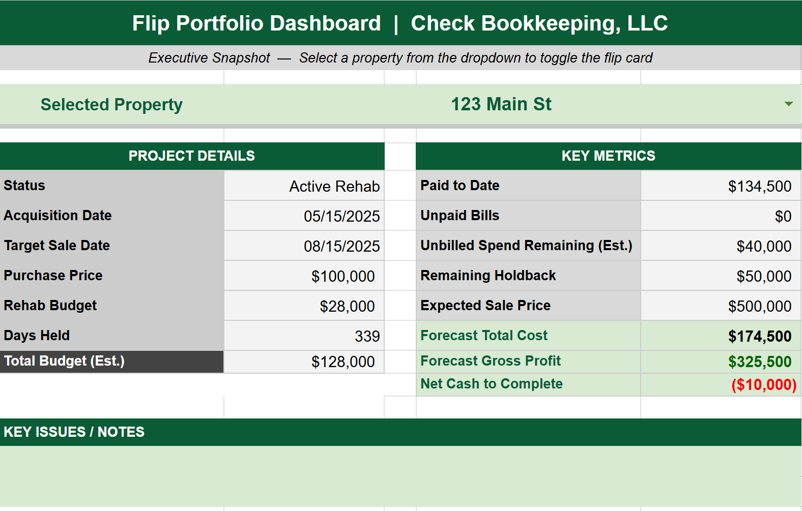 Track purchase, rehab budget, WIP, and bills for each flip.